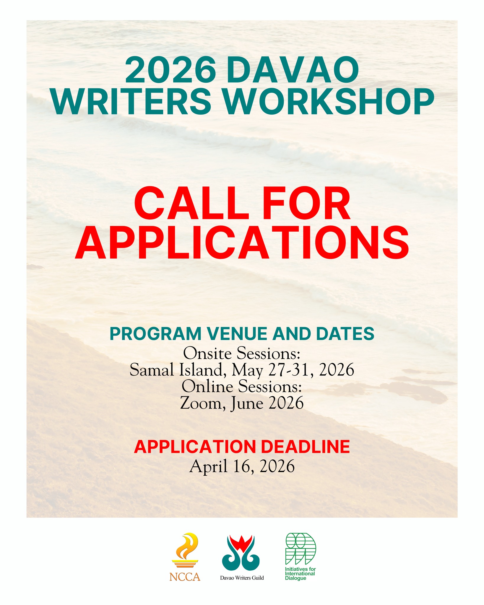 The 2026 Davao Writers Workshop is organized by the Davao Writers Guild in partnership with the Initiatives for International Dialogue (IID), with generous support from the National Commission for Culture and the Arts (NCCA).