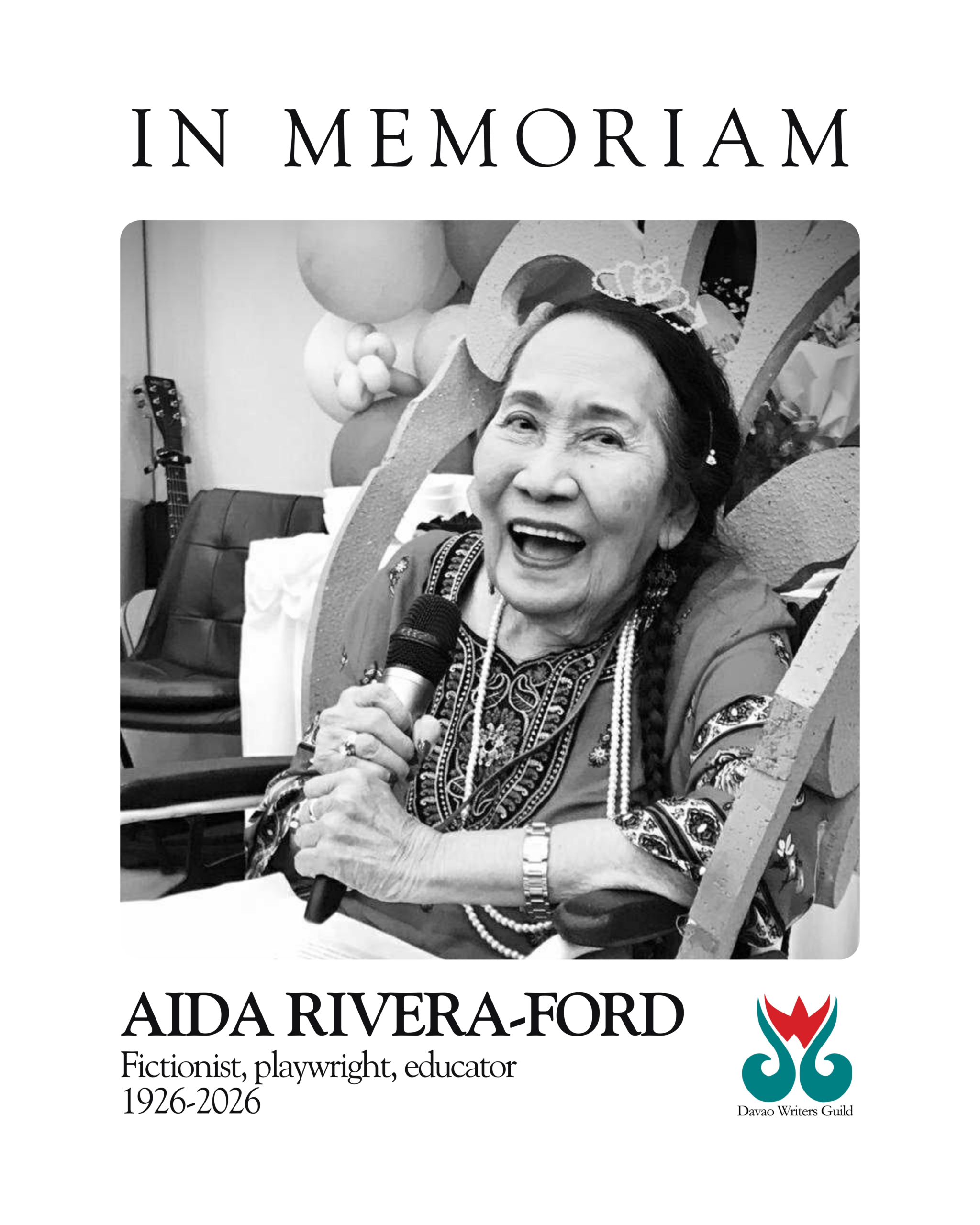 The Davao Writers Guild mourns the passing of our founding member, Aida Rivera-Ford, who died on January 17, 2026, just days before what would have been her 100th birthday.